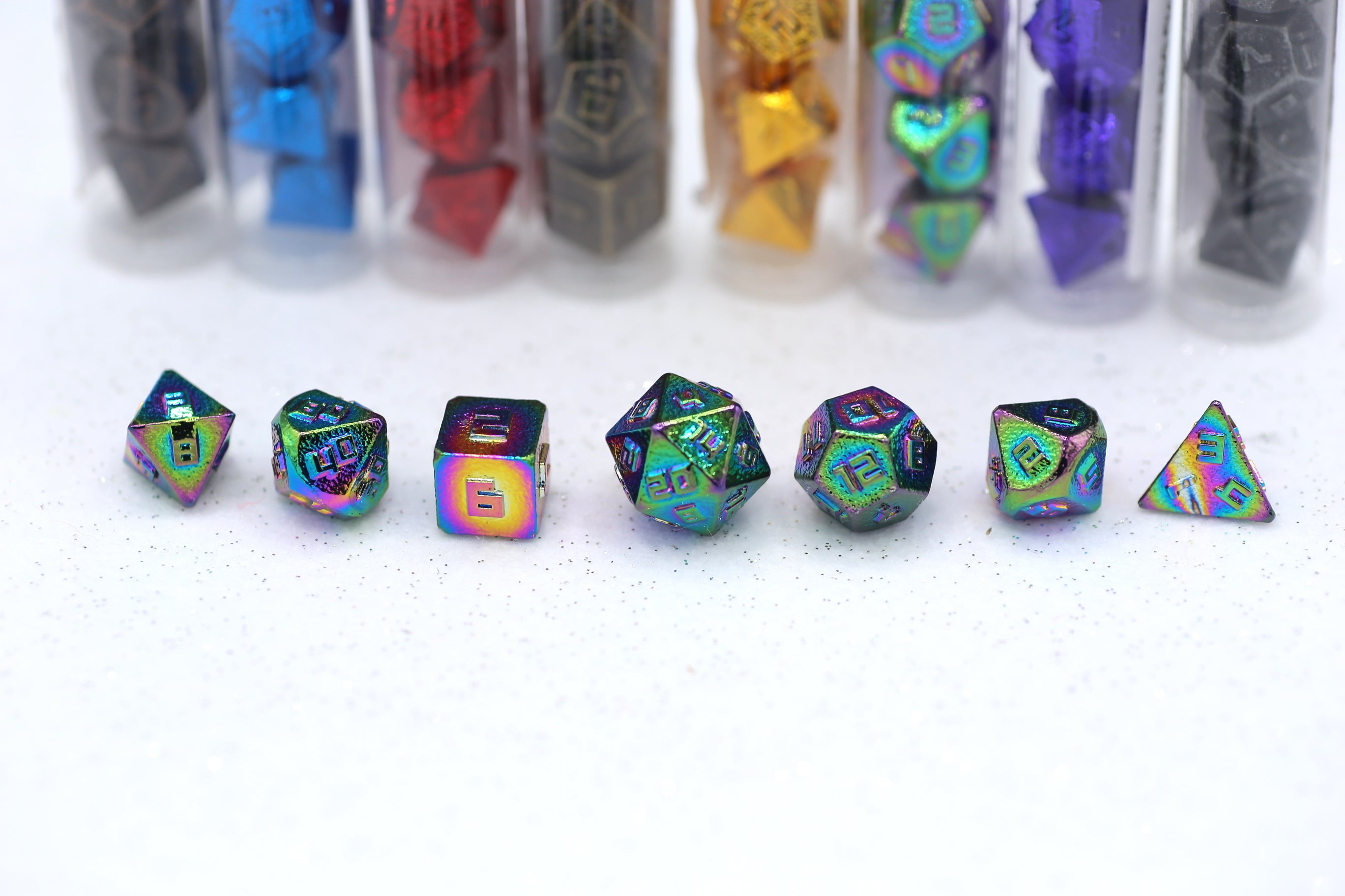 Set of 7 10MM solid metal polyhedral dice in Rainbow.