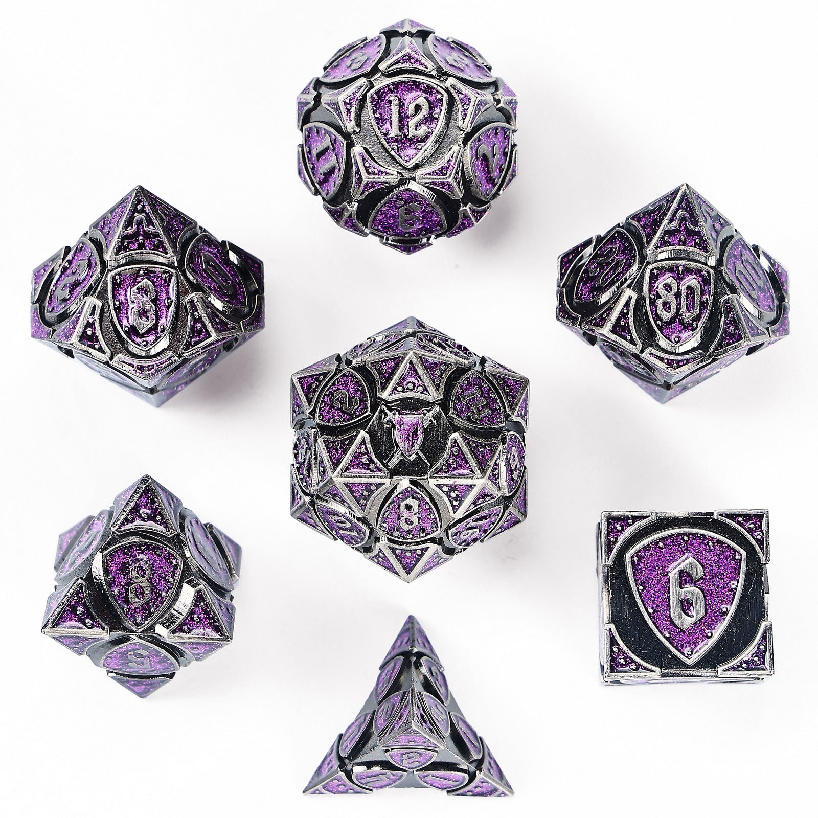 Set of 7 solid metal polyhedral dice with a design inspired by the fighter class!