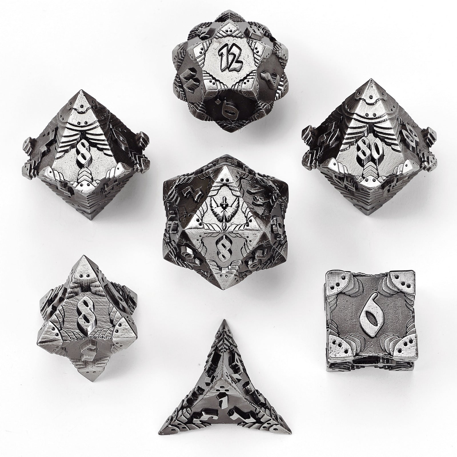 Set of 7 solid metal polyhedral dice with a design inspired by the fighter class!