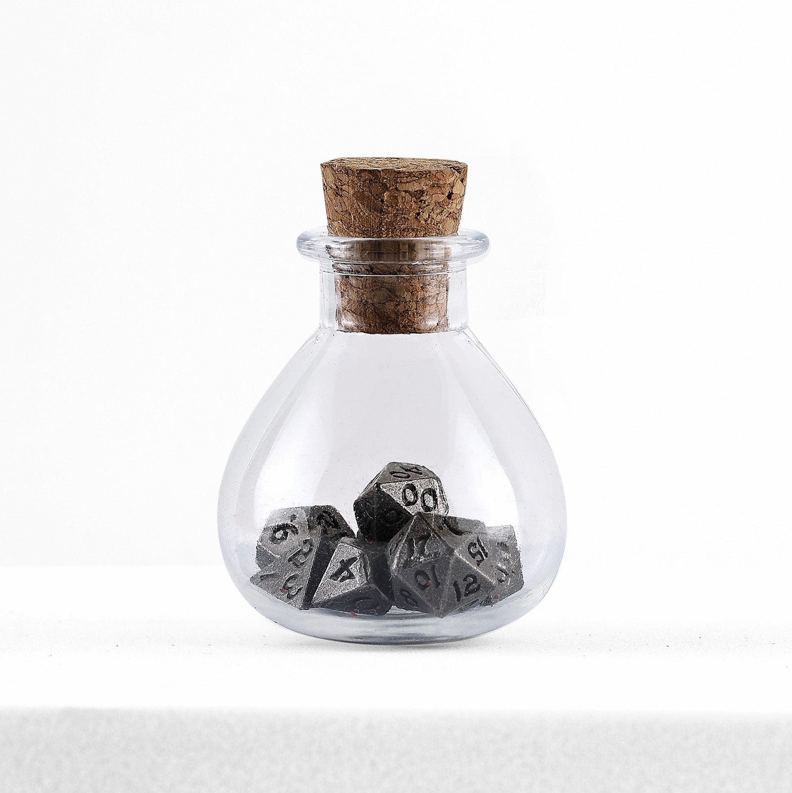 Set of 7 mini solid metal polyhedral dice in Ancient Silver. Each set comes in a tiny potion bottle!