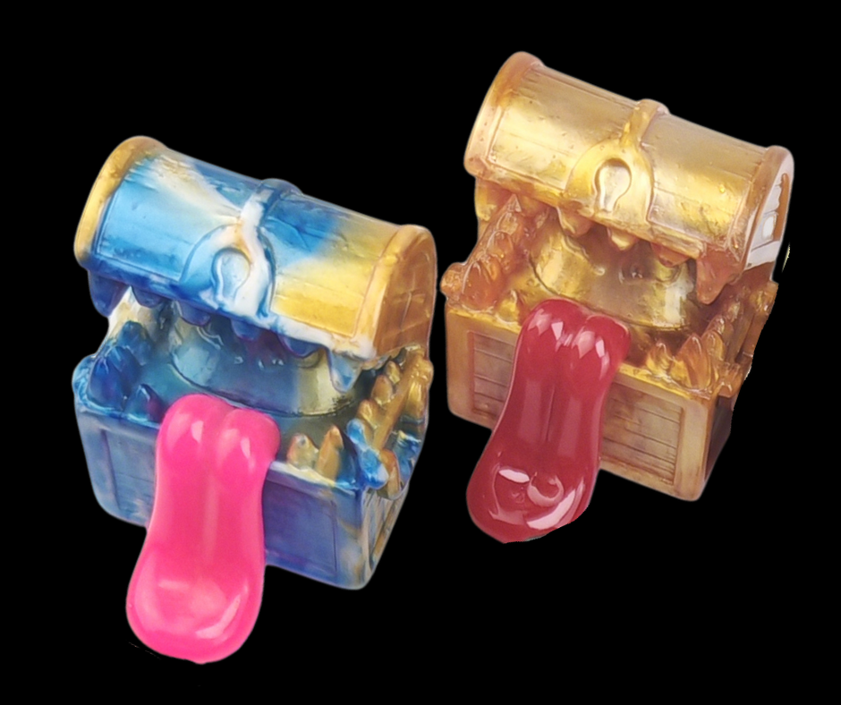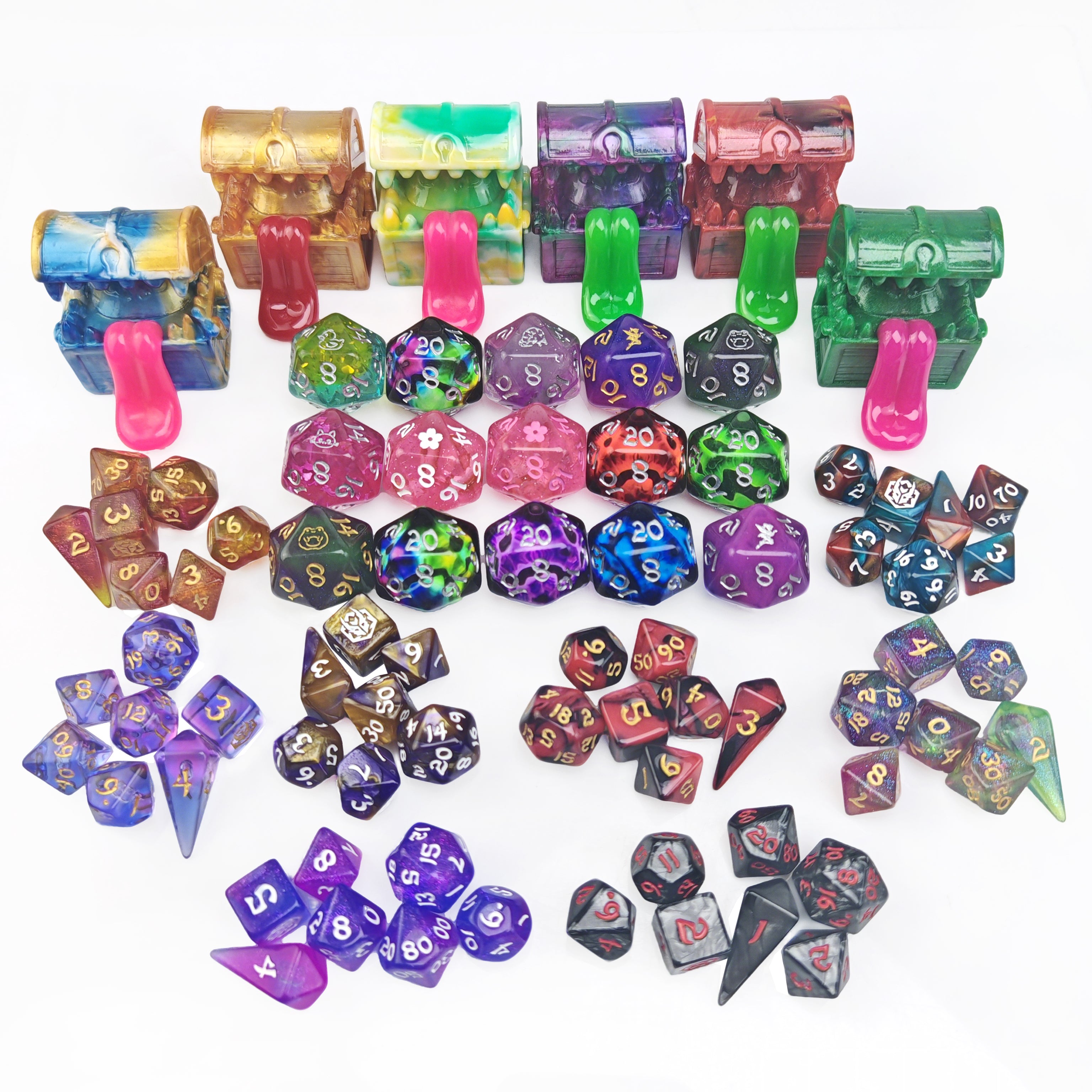 This mystery box contains one random premium resin treasure chest mimic, one set of mini acrylic dice, and one random resin D20!