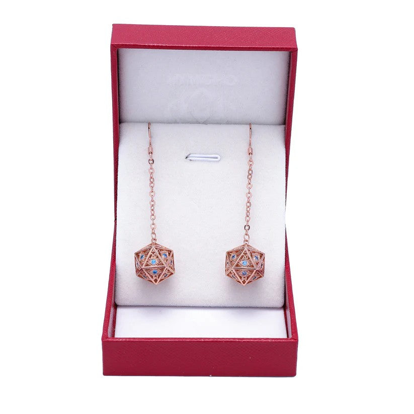 Dragon's Eye D20 Earrings - Rose Gold w/Blue Gems