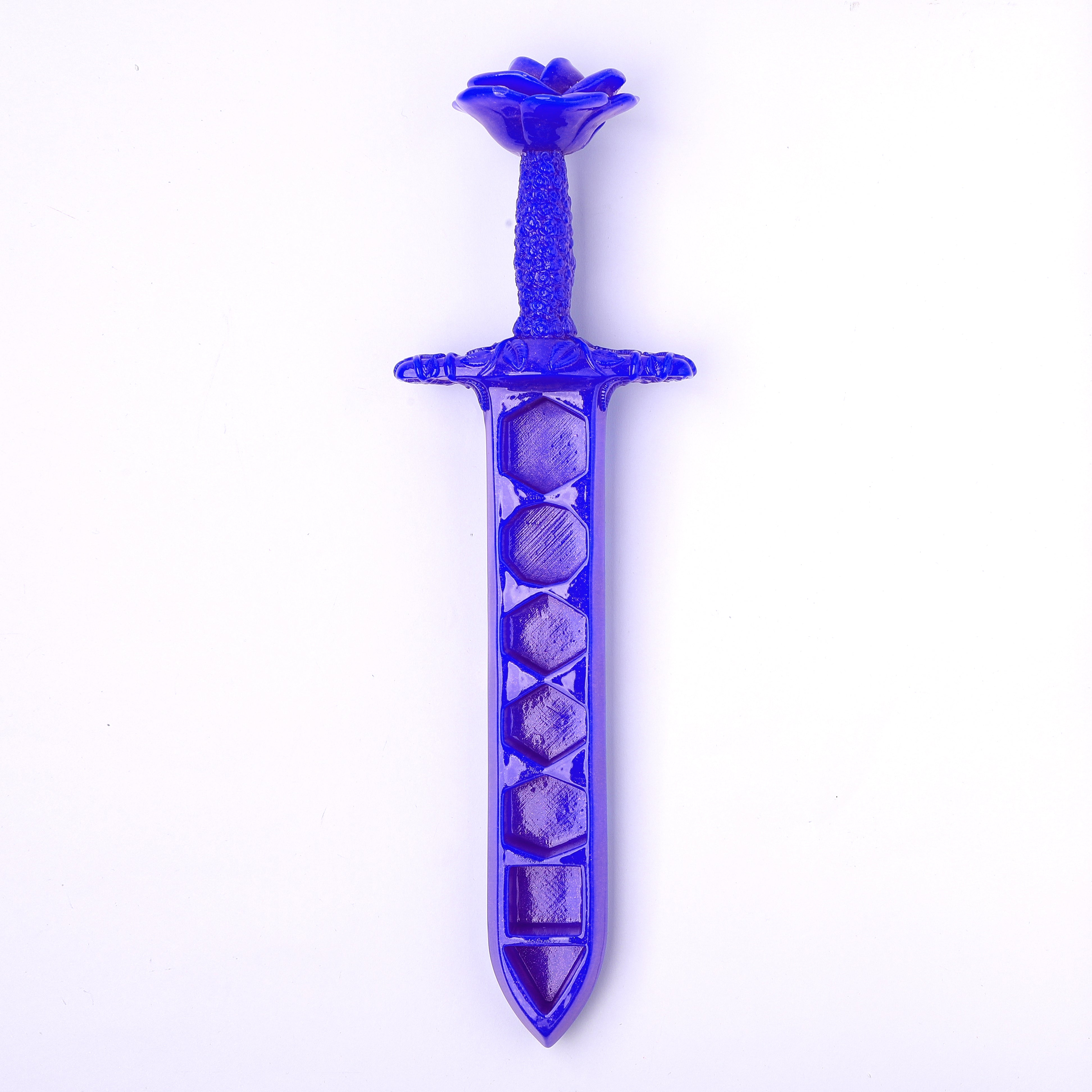 This amazing dagger dice case is made from cast resin, features a beautiful rose at the end of the hilt, holds a full set of 7 polyhedral dice, comes with it's own sheath, and is available in six different colors! (dice sold separately)