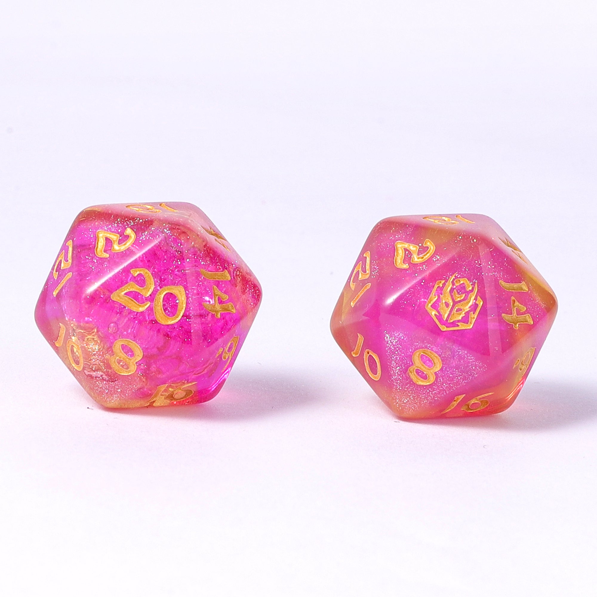 These rounded edge dice sets are larger than most and feature a second D20 and unique shaped D4.