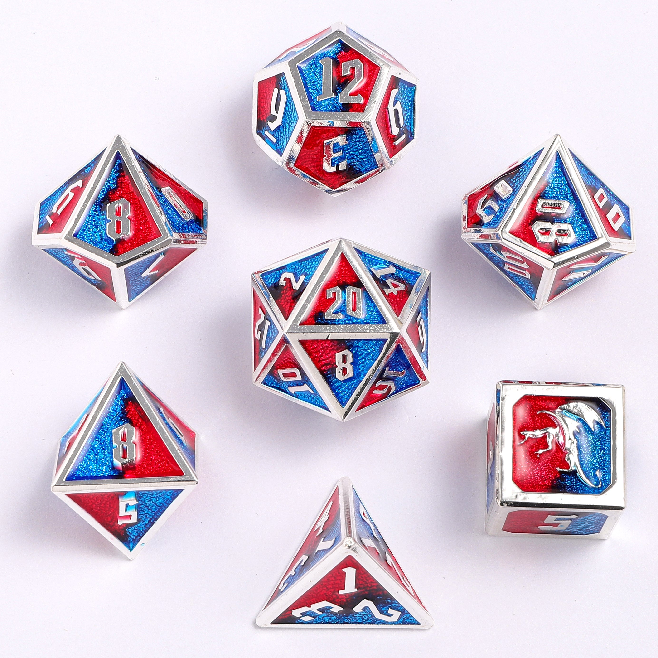 Set of 7 polyhedral dice in Solid metal silver finish with red and blue enamel.