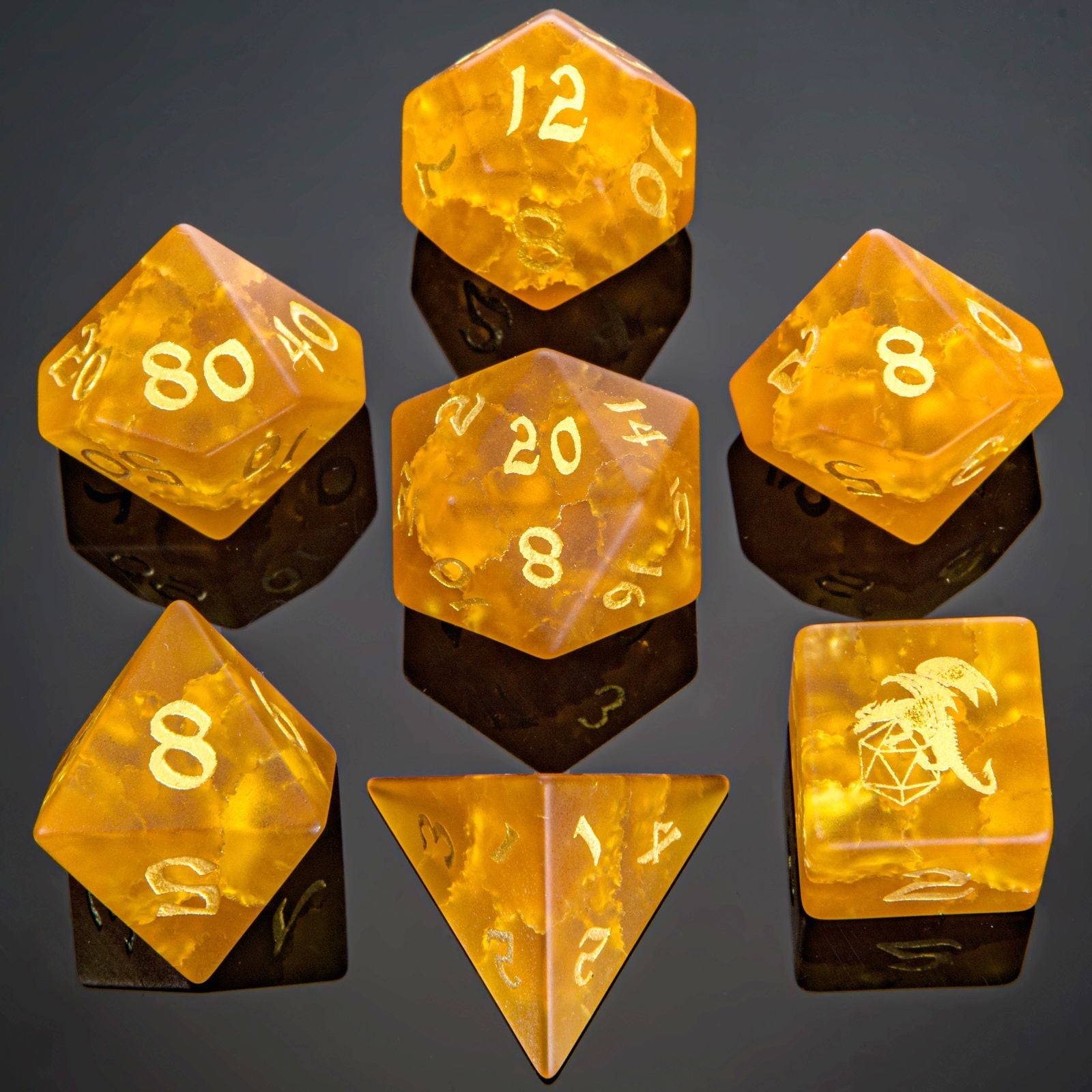 Set of 7 polyhedral dice in frosted amber glass, comes in embossed leather dice box featuring various dragon art.