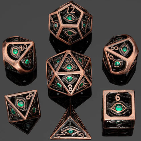 Set of 7 polyhedral dice in ancient copper with emerald green gems.