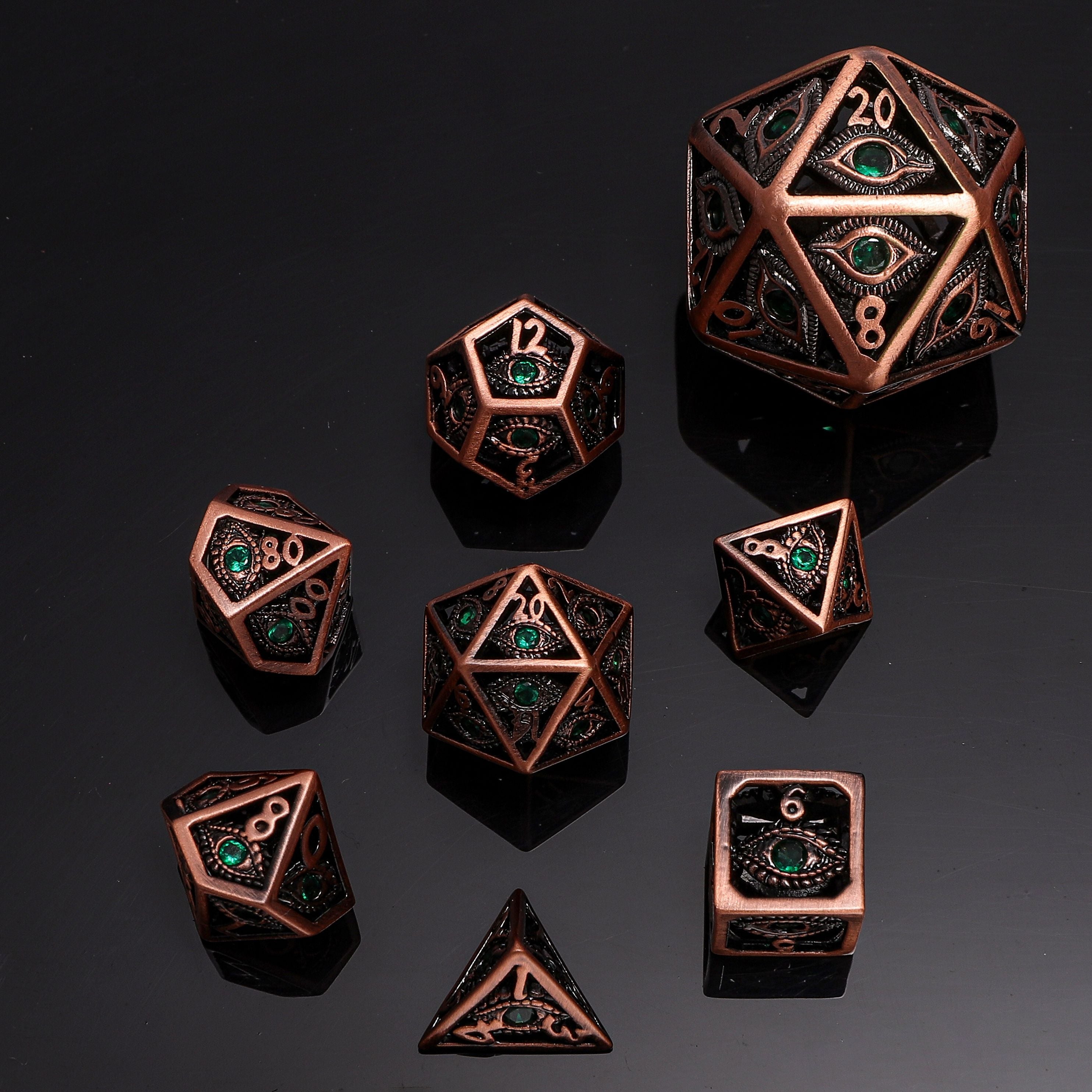Set of 7 mini polyhedral dice in Ancient Copper with Emerald Green Gems.