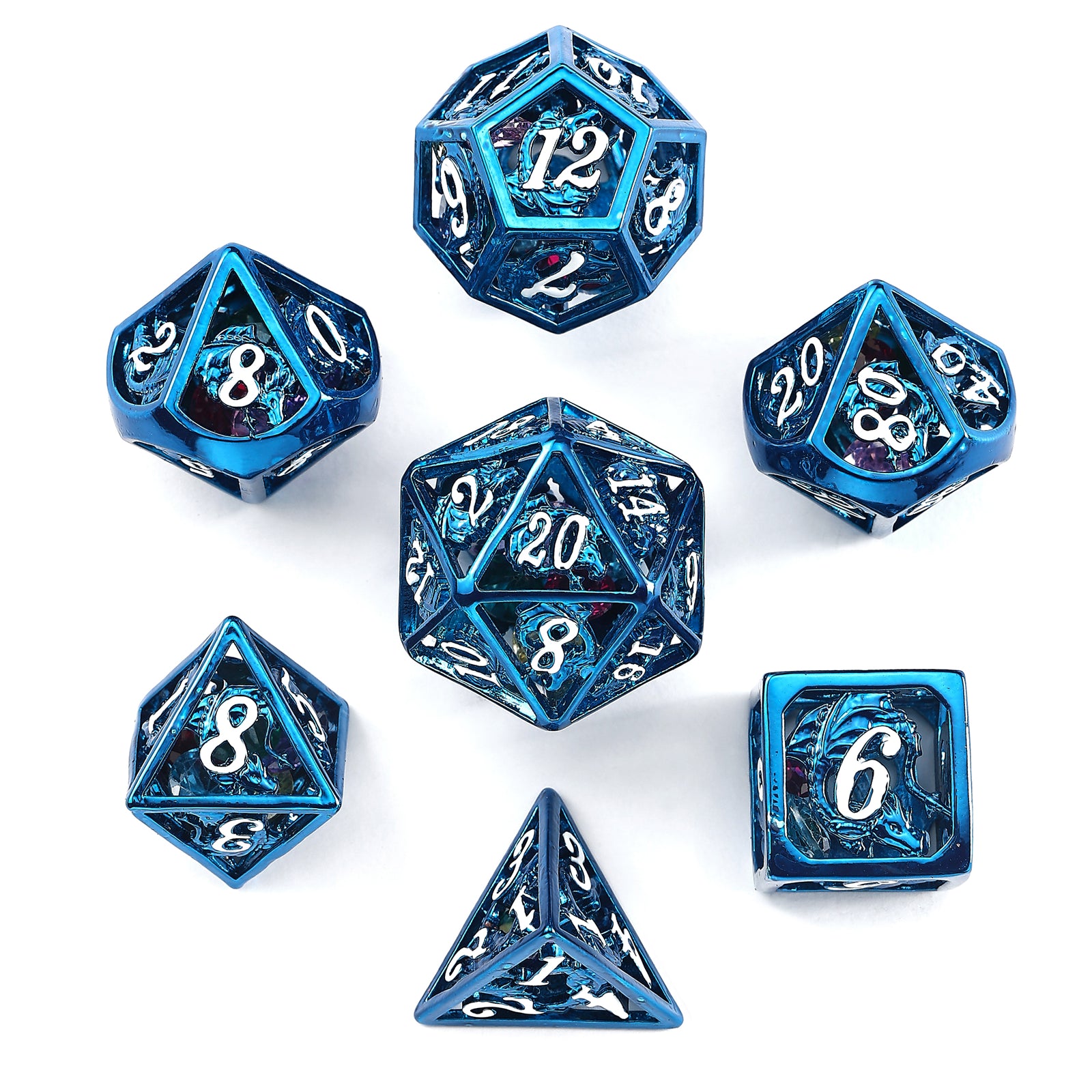 Set of 7 polyhedral dice in Blue hollow metal with colorful gems inside the dice.